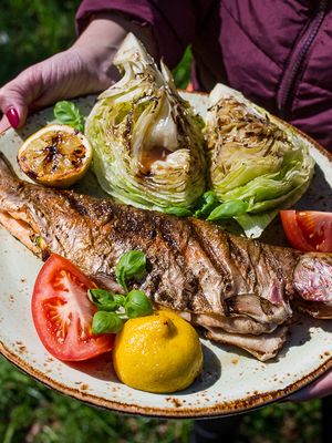 Išimkite upėtakį iš grotelių, leiskite jam kelias minutes pailsėti. Tuo tarpu paruoškite padažą salotoms: sumaišykite alyvuogių aliejų ir balsamiko actą pagal skonį. Supilkite padažą ant salotų ir dar kartą švelniai sumaišykite. - Skonis: