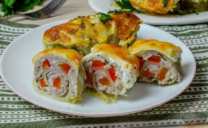 Kiniškų kopūstų suktinukai su faršu ir paprikomis (orkaitėje)