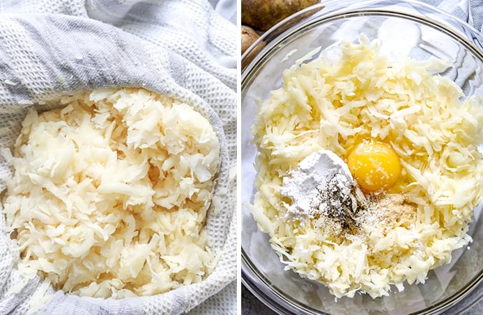 Drėgmė Iš bulvių norėsite pašalinti kuo daugiau drėgmės. Sutarkuotas bulves sudedu į virtuvinį rankšluostį ir, sukdama rankšluostį, išspaudžiu iš jų kiek įmanoma daugiau.
