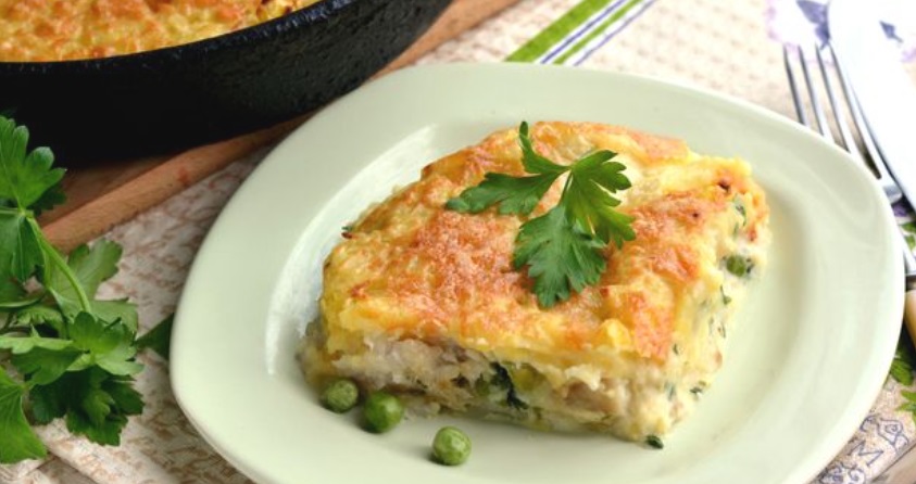 Žuvies filė iš pradžių atskirai kepama piene, o paskui – pieno padaže su žolelėmis ir žirneliais, po bulvių košės ir tarkuoto sūrio sluoksniu. Rezultatas – sultingas, švelnus, labai skanus bulvių ir žuvies apkepas su gardžia sūrio plutele.