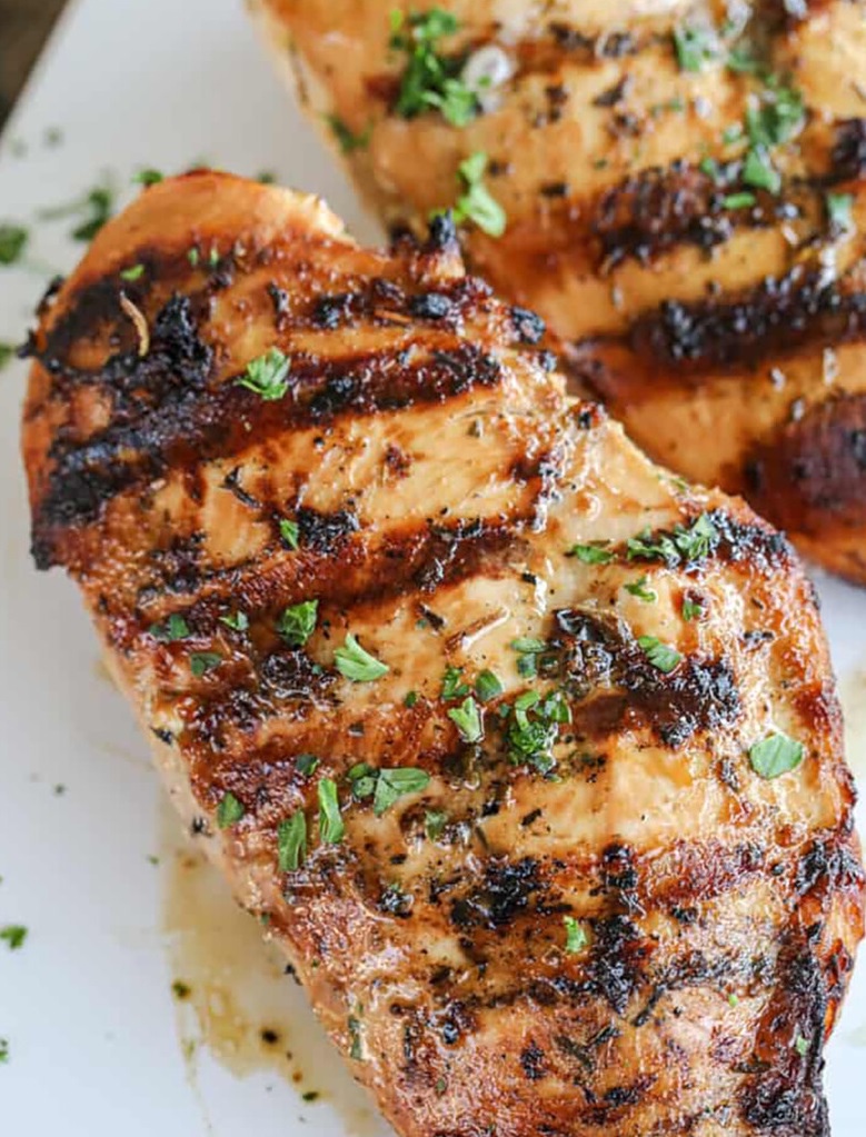 Marinuotą vištienos krūtinėlę kepkite ant grotelių, kol mėsos termometras parodys 165 °F, maždaug 7-8 minutes iš kiekvienos pusės. Prieš patiekdami leiskite vištienai pailsėti.