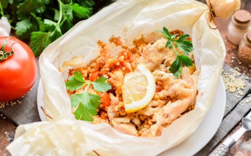 Kepta jūrų lydeką su kuskusu ir pomidorais galima patiekti suvyniotą į pergamentą ir padėtą lėkštėje.