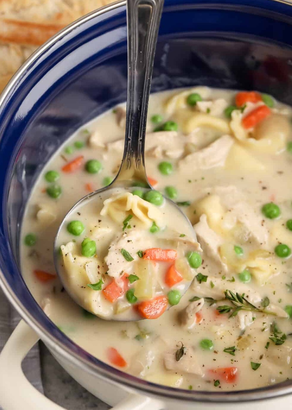 Šioje kreminėje vištienos tortellini sriuboje yra sočių daržovių, švelnios smulkintos vištienos ir gausiai sūrio tortellini. Visavertis patiekalas dubenėlyje.