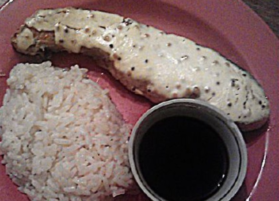 Paruoštą lašišą grietinėlės padaže galima patiekti su virtais ryžiais ir sojų padažu.