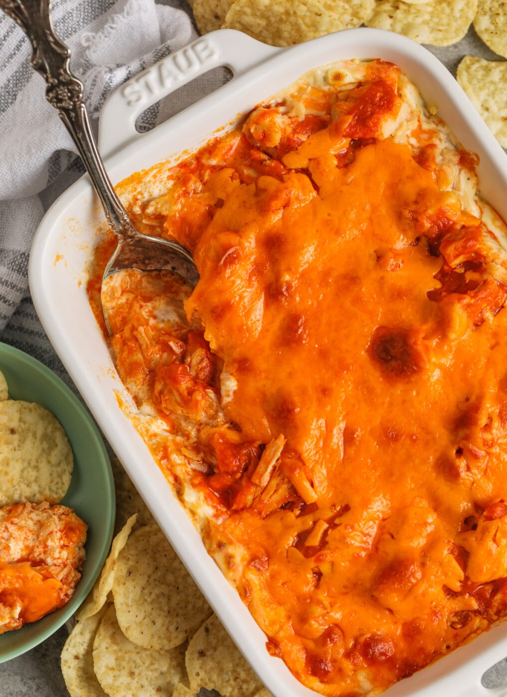 „Buffalo Chicken Dip” – puikus bet kokio vakarėlio dipas, kurio skonis įkvėptas buivolų sparnų, iškeptas iki burbuliuojančio tobulumo.