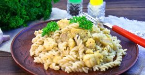 Italų virtuvėje dažnai derinama žuvis ir makaronai. Šiam patiekalui ypač tinka jūros žuvys, kurios beveik neturi kaulų, pavyzdžiui, menkė. Patiekalas paruošiamas gana greitai ir lengvai: kol verda makaronai, žuvis troškinama su svogūnais ir aromatinėmis džiovintomis žolelėmis. Viską sudėjus gaunamas skanus, sotus ir lengvas patiekalas.