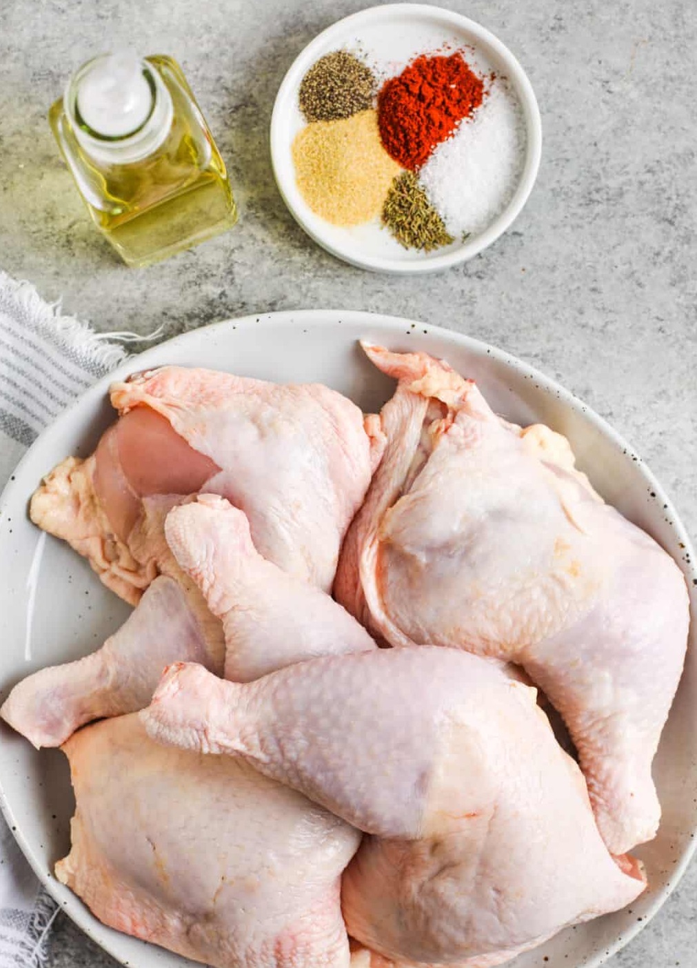 Viščiukai: Viščiukų kojos – tai šlaunelės ir blauzdelės kartu, todėl jų porcija yra didesnė ir tinka didesniam apetitui. Šiame recepte naudojama vištiena su kaulais ir oda. Apšlakstykite aliejumi, kad prieskoniai geriau priliptų, o odelė taptų traški.