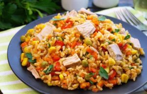 Ryžiai su daržovėmis ir konservuotu tunu (kepti keptuvėje)