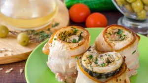 Suvyniokite skumbrės suktinukus su krūtinėlės griežinėliais ir kiekvieną jų sutvirtinkite drėgnu dantų krapštuku.