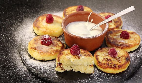 Sūrio pyragėlius patiekite su grietine, kondensuotu pienu, uogiene, džemu, džemu, šviežiomis uogomis.