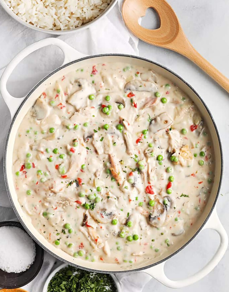 Tai klasikinis vištienos a la king patiekalas su naminiu grietinėlės padažu.
