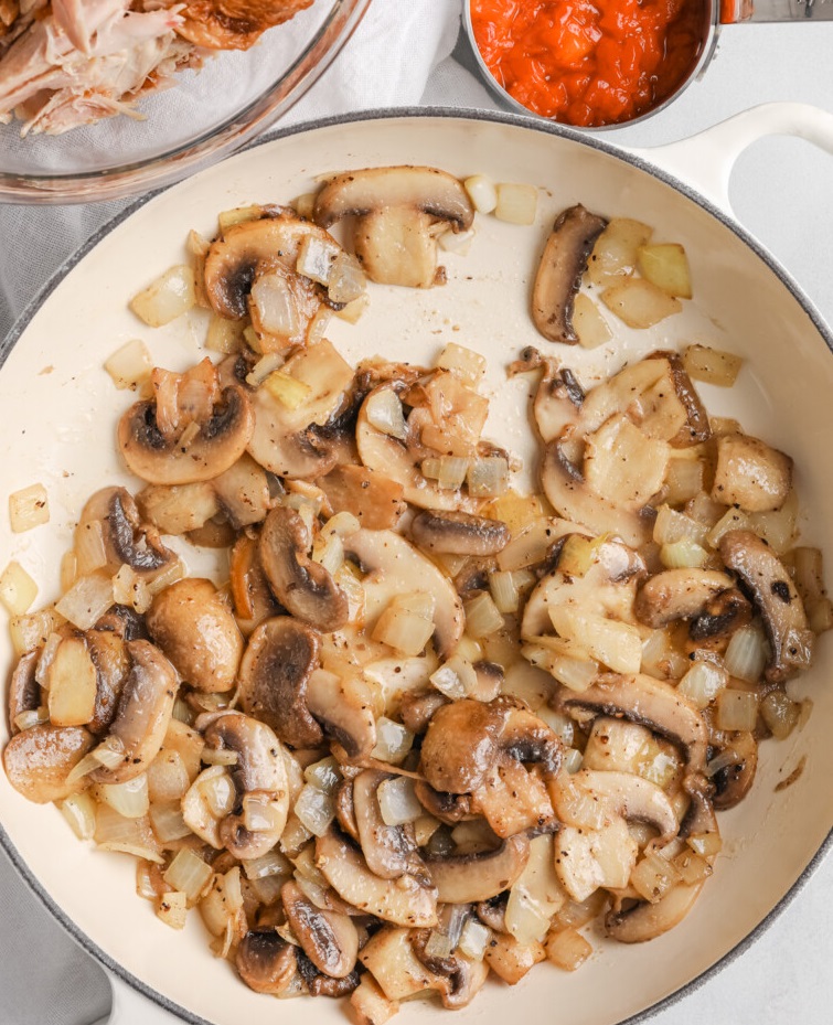 Didelėje 12 colių keptuvėje ant vidutinės ugnies ištirpinkite sviestą. Sudėkite grybus ir svogūnus ir kepkite, kol jie pradės minkštėti, apie 5 minutes.
