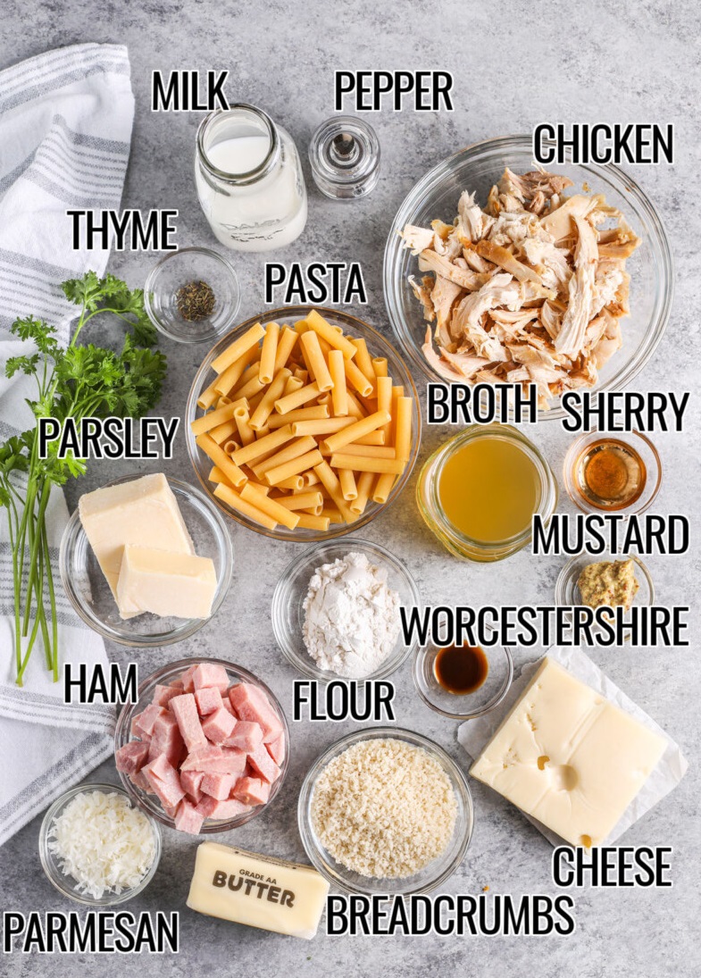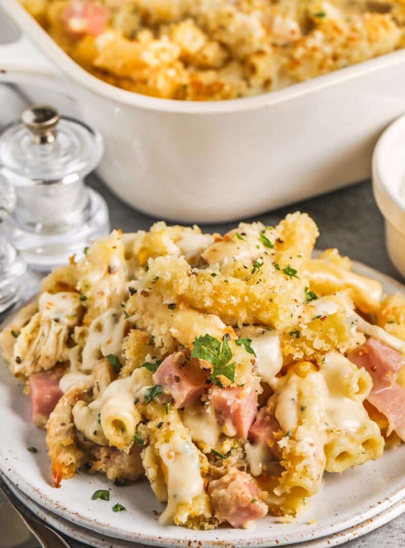 Vištienos ir kumpio įdėjimas į makaronus, kad pagamintumėte „Chicken Cordon Bleu Casserole