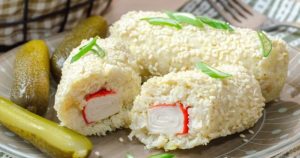 Žuvies dešrelės su krabų lazdelėmis yra skanios, sultingos ir gana sveikos. Suvyniokite faršą į maistinę plėvelę, suformuokite dešreles ir išvirkite vandenyje. Paruoštus kotletus pabarstykite sezamo sėklomis, kurios švelniai papildys žuvies patiekalo skonį.