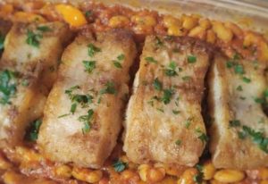 Recepto nuotrauka: Žuvis, kepta su pupelėmis pomidorų padaže – 1 žingsnis.