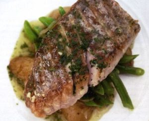6. Žuvį patiekite su daržovėmis (pvz., jaunomis bulvėmis ir šparaginėmis pupelėmis). Apšlakstykite padažu.
